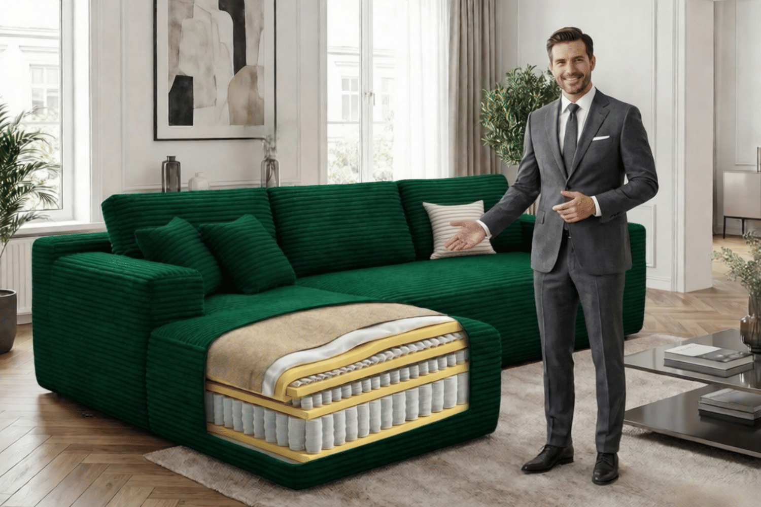 By using a traditional spring-based structure and significantly reducing the amount of foam, our sofa minimizes odors commonly associated with chemical materials. Improved airflow helps prevent smell buildup, creating a cleaner and more pleasant indoor environment. In contrast, large solid foam blocks used in compressed sofas may release stronger odors over time due to limited ventilation.