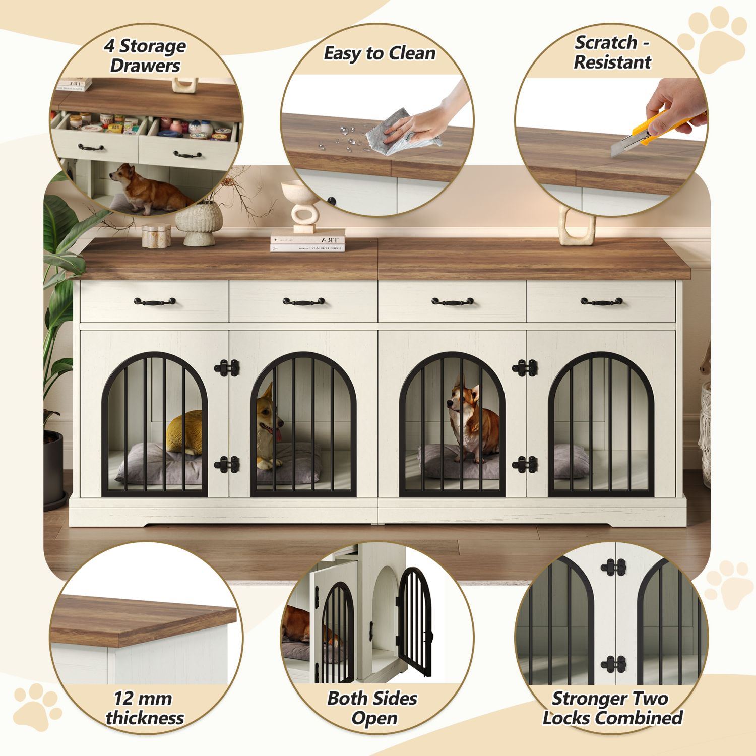 Built to Last & Pet-Safe: Crafted from thick mdf with sturdy iron bar doors, this cabinet offers excellent stability and chew resistance. The thickened tabletop adds extra durability, providing a reliable surface for everyday use. Each compartment is designed for strength and safety, ensuring pets are secure and owners are worry-free.
