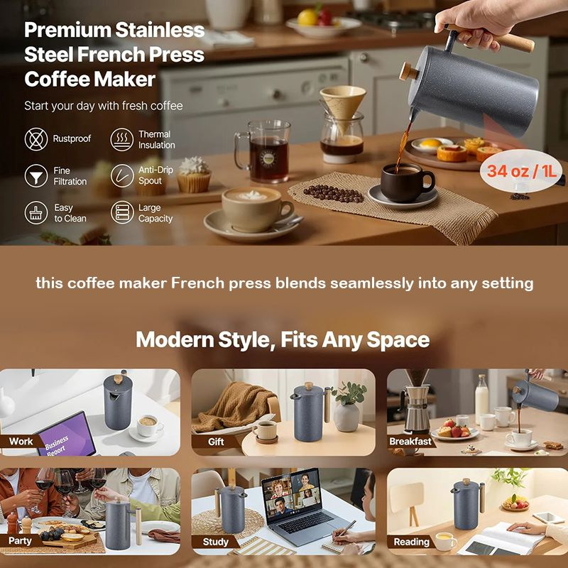 5.With its sleek, timeless design, this coffee maker French press blends seamlessly into any setting.