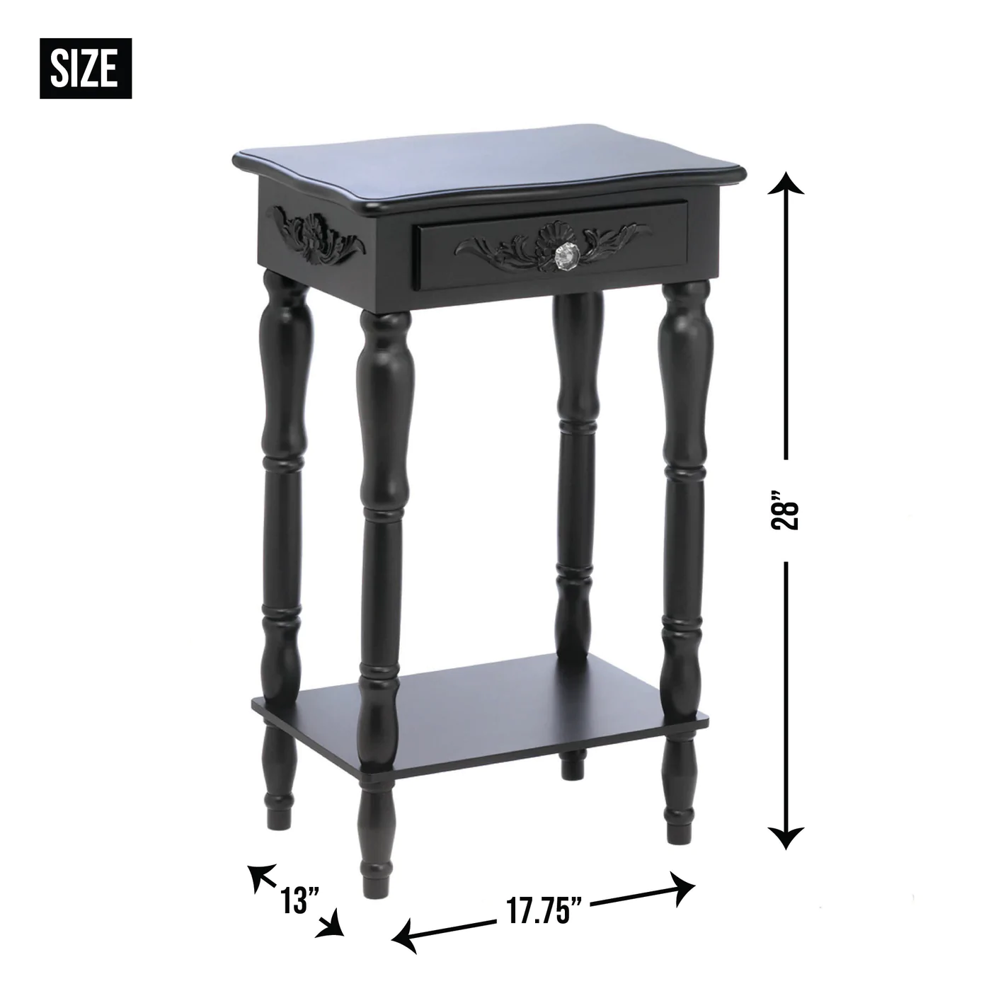 • Curvy carvings and a dazzling pull knob add surprise touches of opulence, while an elegant silhouette beautifully complements your eclectic décor. Functional and stunning, this table will look amazing anywhere you display it!