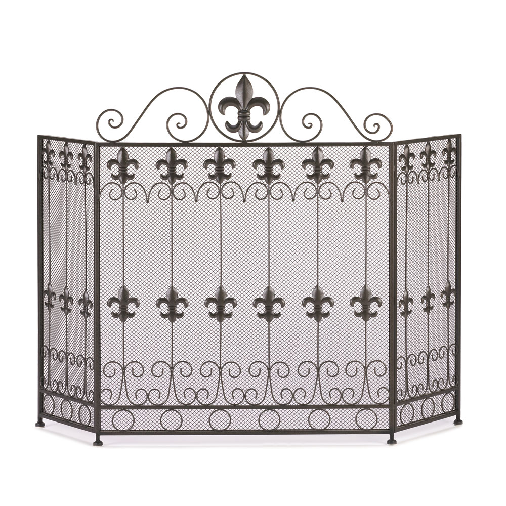 • A touch of French form will add a dash of style to your fireplace. This beautiful iron screen features a gorgeous pattern of fleur de lis metal cutouts accented by scrolling designs. The top features a large fleur de lis that accentuates its continental charm.
