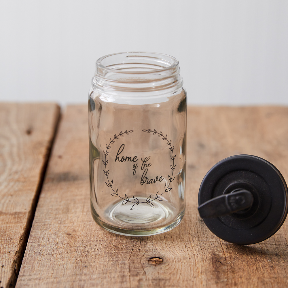 Display your patriotism for Independence Day and all year long with this soap dispenser. It feature ''Home of the Brave'' surrounded by olive branches. Holds one pint of liquid. Clear Glass. Features a black pumper.
